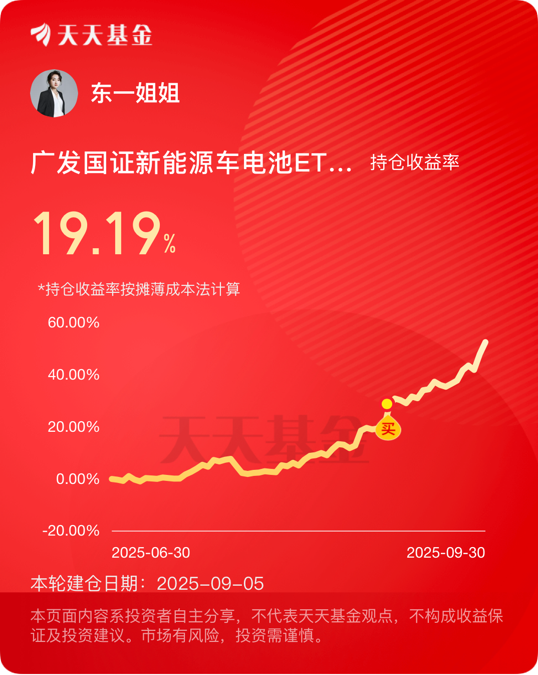 这只电池基金$广发国证新能源车电池ETF联接C$ 再次大涨3.14%,目前累计收益率19.19%,我现在最后悔的事就是买少了,只有等节后回来加仓啦!