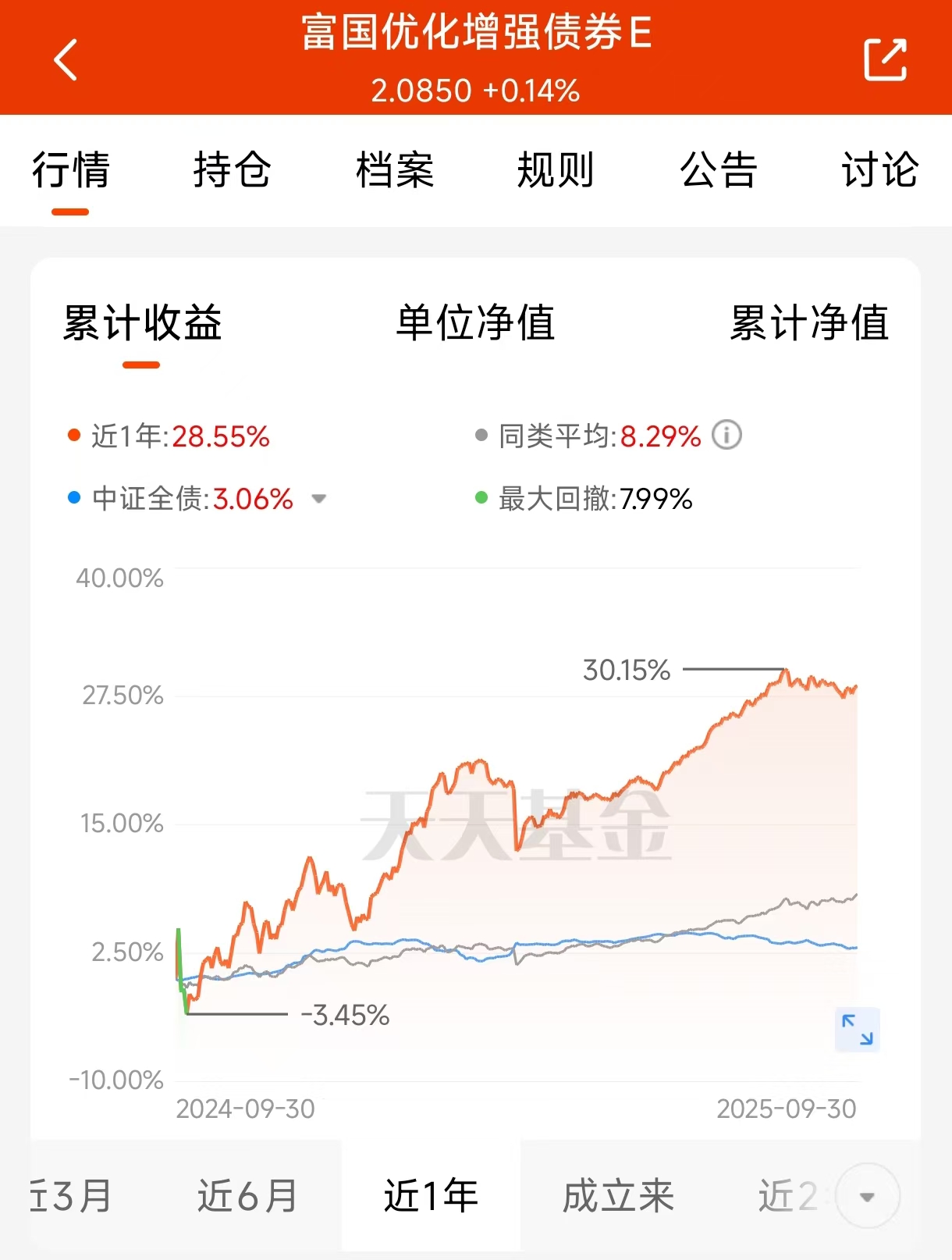 之前有人讨论什么持股过节持币过节,我觉得都没必要。你如果买的基金好,你根本没有这个问题,买的基金不好,你其实心里就已经有答案了。我觉得你们其实也可以看看$富国优化增强债券E$(018980)这种基金,一年能赚快30%,有4成债仓做底有积累,最大回撤不到8%,比沪深300小差不多一半。能攻能守,这种比较能拿得住,收益也不差。#国际金价史上首次升破4000美元大关#