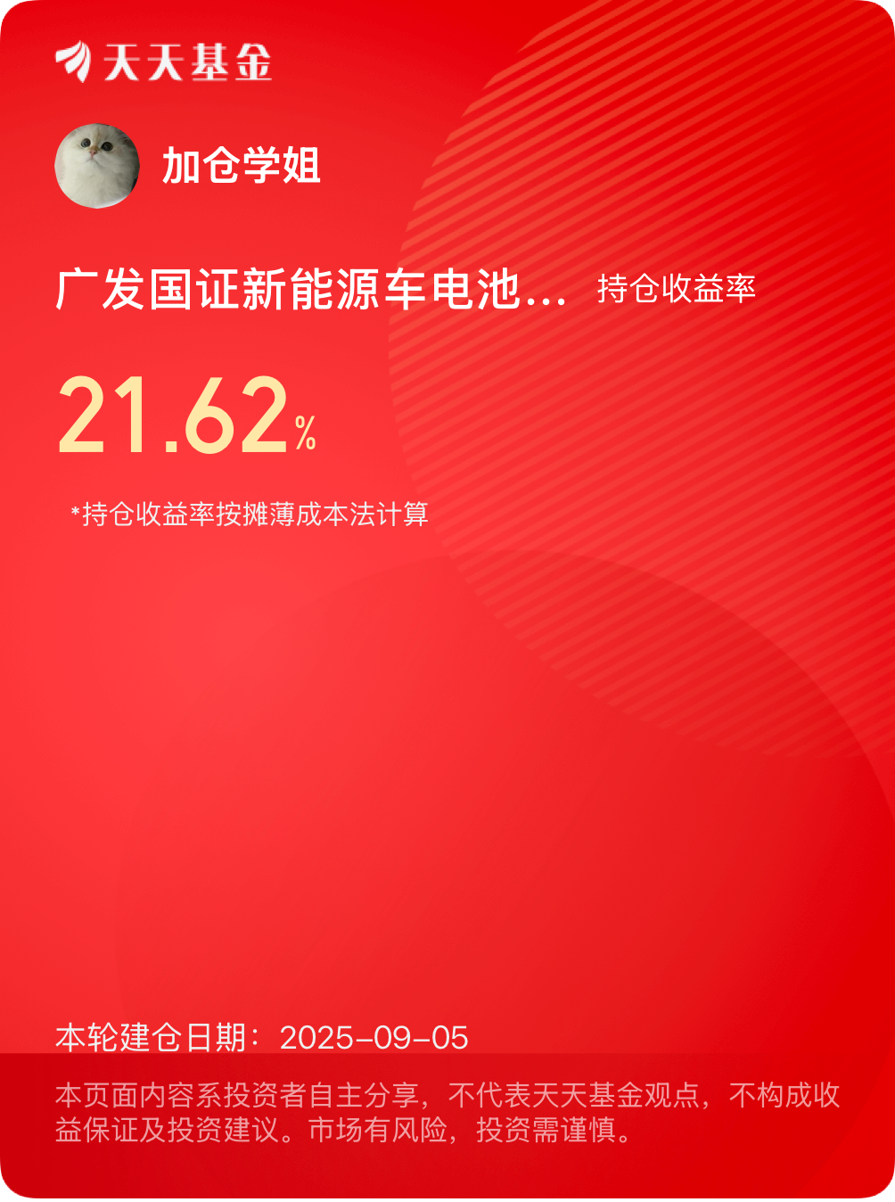收益续航持续UP,$广发国证新能源车电池ETF联接C$ 今天又是涨2.04%,连涨3天,盈利超21%,这波趋势行情又抓到了,我今天重点追了一笔,明天更新的话,收益率可能会被稀释,今天先标记一下~#晒收益#