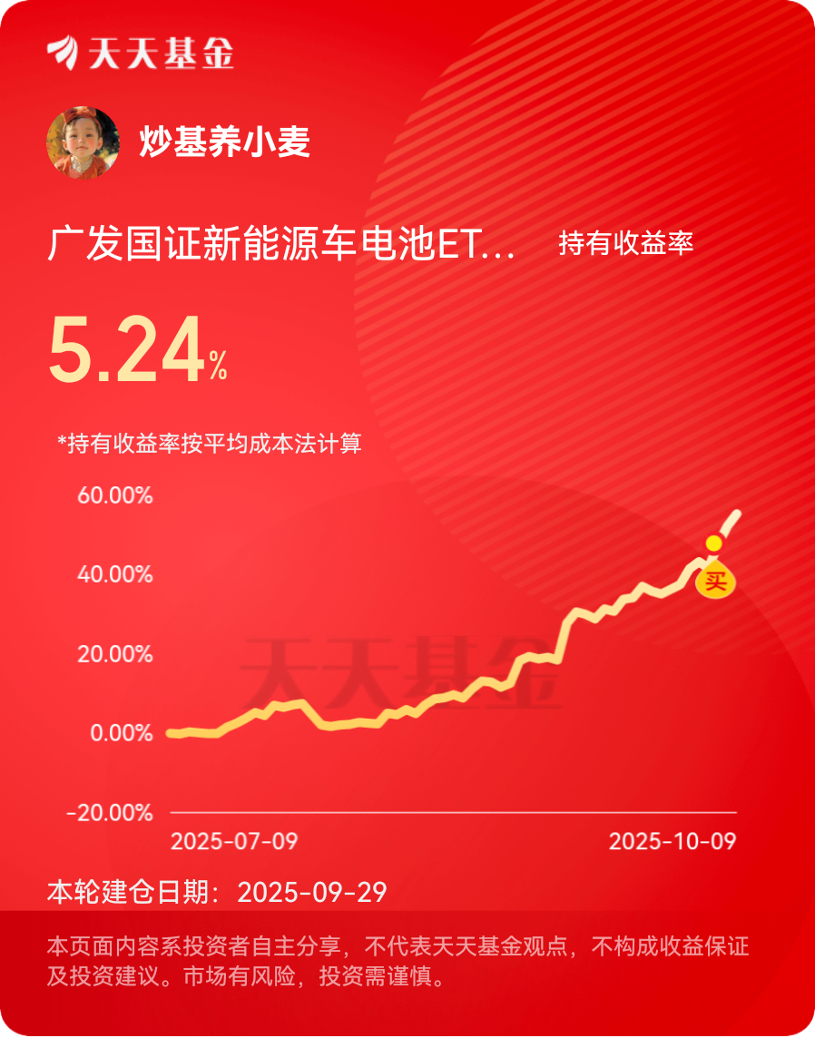 #晒收益# 今天指数看着开门红,可散户赚钱效应是真差,好多人手里的票都没动静。还好我节前加仓的 $广发国证新能源车电池ETF联接C$