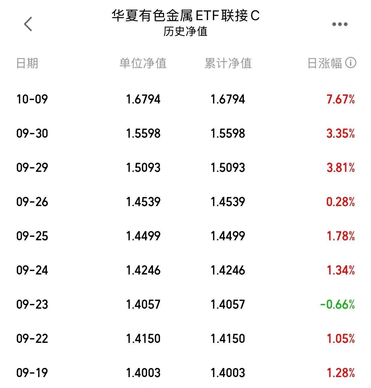 持仓涵盖有色金属多细分赛道,增收能力强,黄金占比达13%,$华夏有色金属ETF联接C$连红6天,昨天大涨7.67%,今天给机会必入