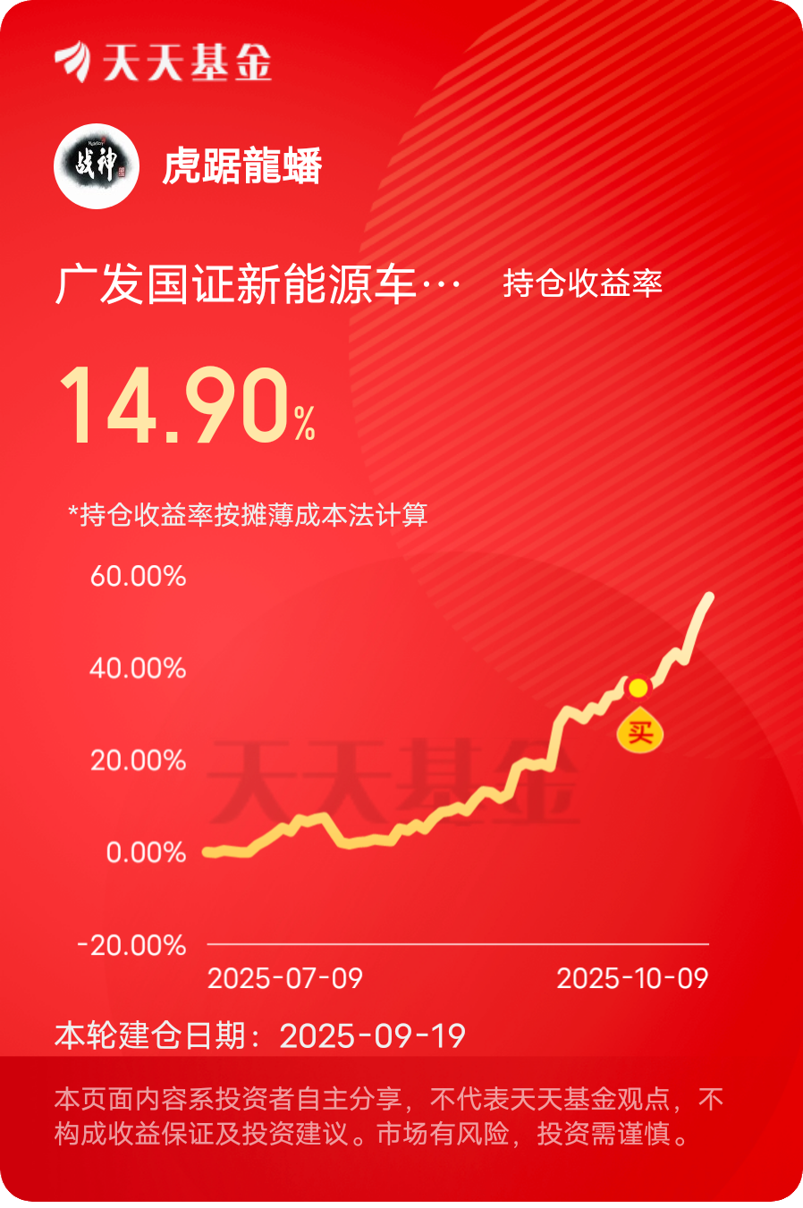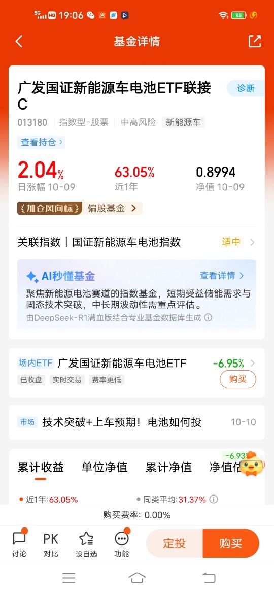 九月份以来,电池板块成为A股市场最靓的仔,新能源车电池主题热度攀升,基民小虎认为会是全年投资主线,现在还能入场,今天又买入了$广发国证新能源车电池ETF联接C$,这只指数基金聚焦新能源车电池赛道,昨天上涨2.04%,近六个月上涨80.24%,在3733只同类基金中排名前5%,表现非常优异!