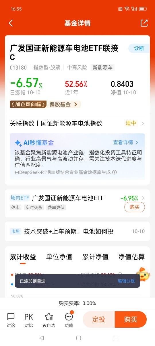 八月份以来,新能源车电池主题热度攀升,电池板块涨幅领跑全市场,当仁不让会是全年投资主线!个人认为,现在还能入场,我已经上车!既然看好那就买,只说不练,那是忽悠人的假把式!@广发基金罗国庆 经理管理的$广发国证新能源车电池ETF联接C$ ,今年以来收益率56.1%(同类基金平均值28.22%),在3418只同类基金中排名前8%,表现非常优秀!