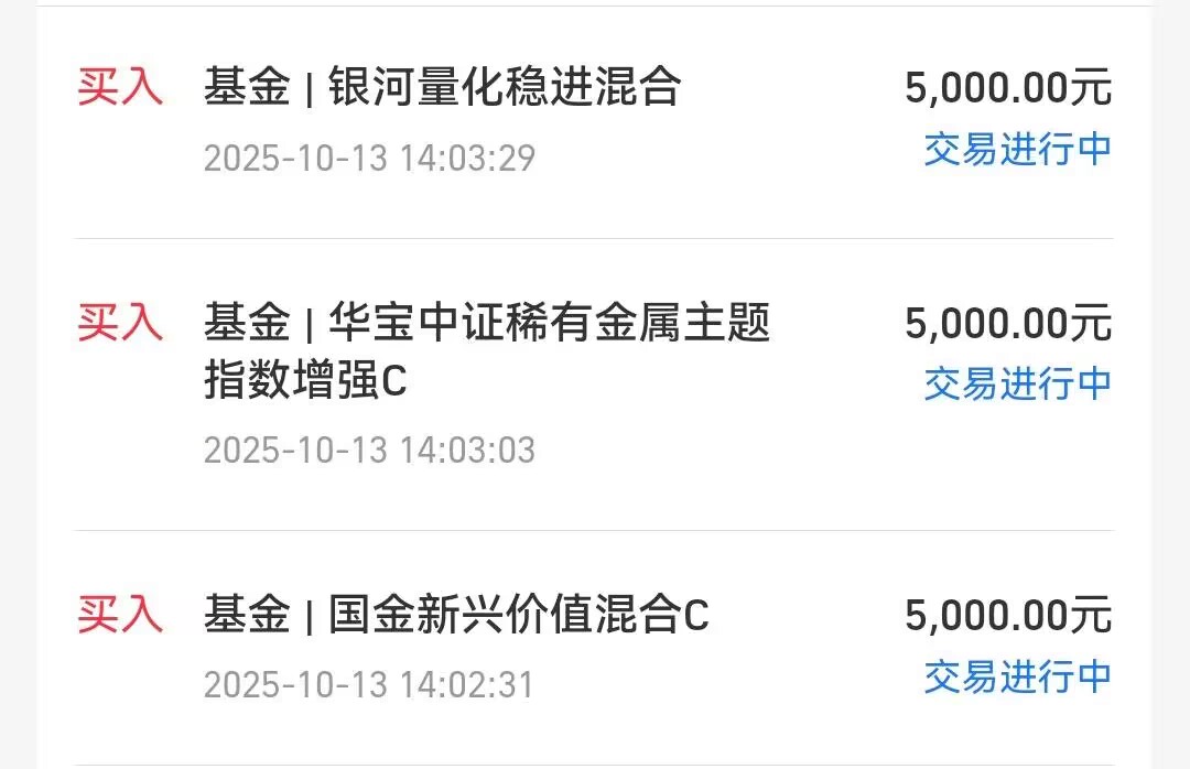 我今天加仓了广发国证新能源车电池、银河量化稳进混合、稀有金属、国金新兴价值,其它基金继续持有待涨。