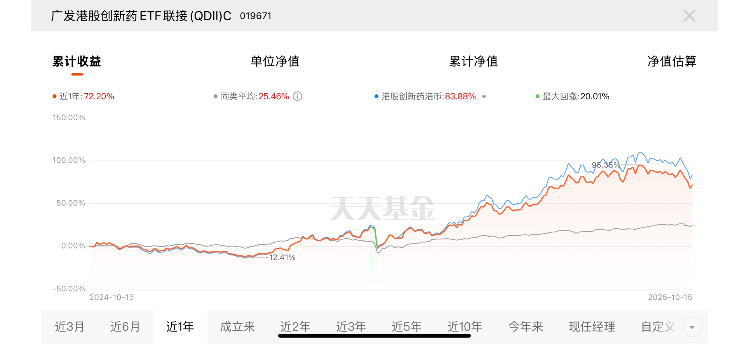 创新药今天涨疯了!特别我重仓的$广发港股创新药ETF联接(QDII)C$ ,之前业绩就好,近一年涨幅72.72%,不说了加仓!