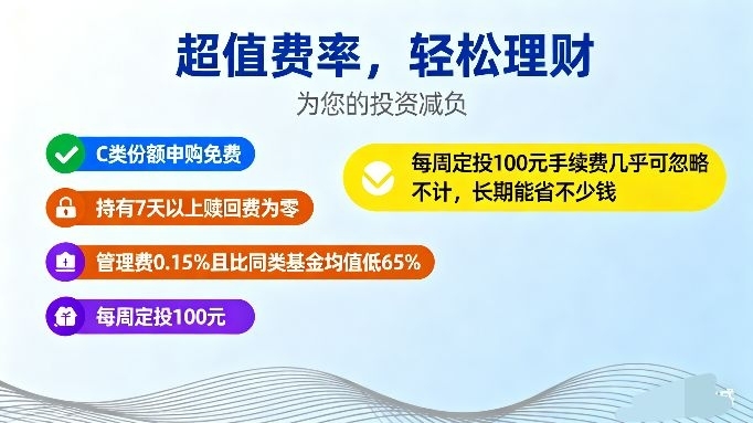 费率方面对大学生太友好了:C类份额申购免费,持有7天以上赎回费为零,管理费才0.15%,比同类基金均值低65%。我每个周定投100元,手续费几乎可以忽略不计,长期下来能省不少钱。