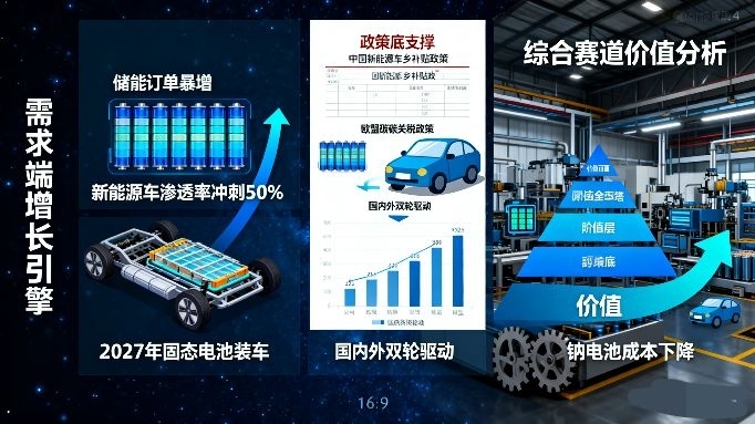 最后看技术面:固态电池预计2027年装车,现在已经有企业开始量产高压密磷酸铁锂,能量密度直接提升15%;钠电池成本降到0.5元/Wh,未来有望替代部分锂电应用。技术迭代不是风险,而是让赛道估值不断抬升的催化剂——每次新技术突破,都是行业的新增长点。