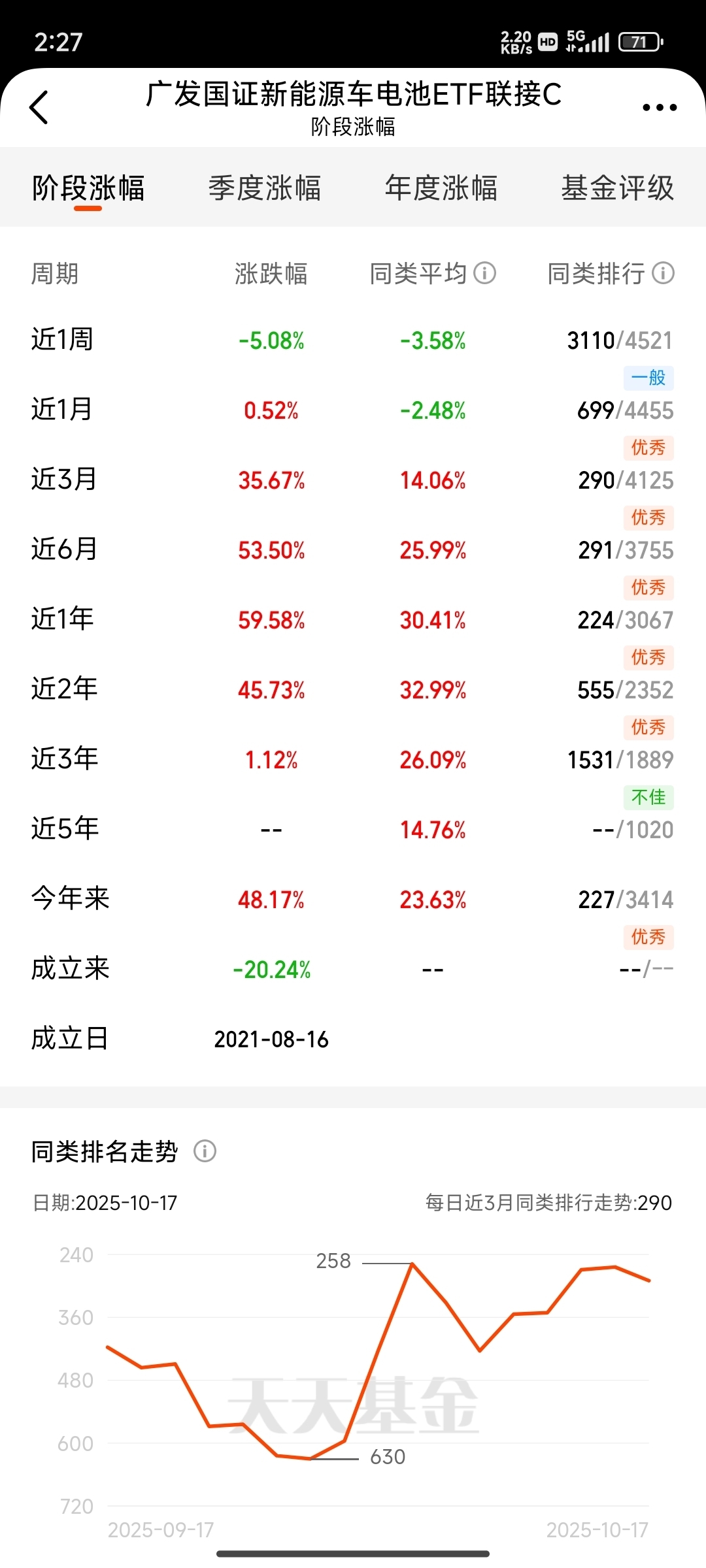 再看业绩表现:别被成立以来-14.54%的收益吓到!那是2022-2023年行业调整拖的后腿,今年以来直接爆发,收益冲到48.1%,近三个月涨了35%,同类排名前10% 我7月份买入时刚好赶上短期回调,虽然现在浮亏2%,但看9月数据就知道,主力资金净流入连续3周为正,指数已经突破年线压力位,中期趋势特别稳。