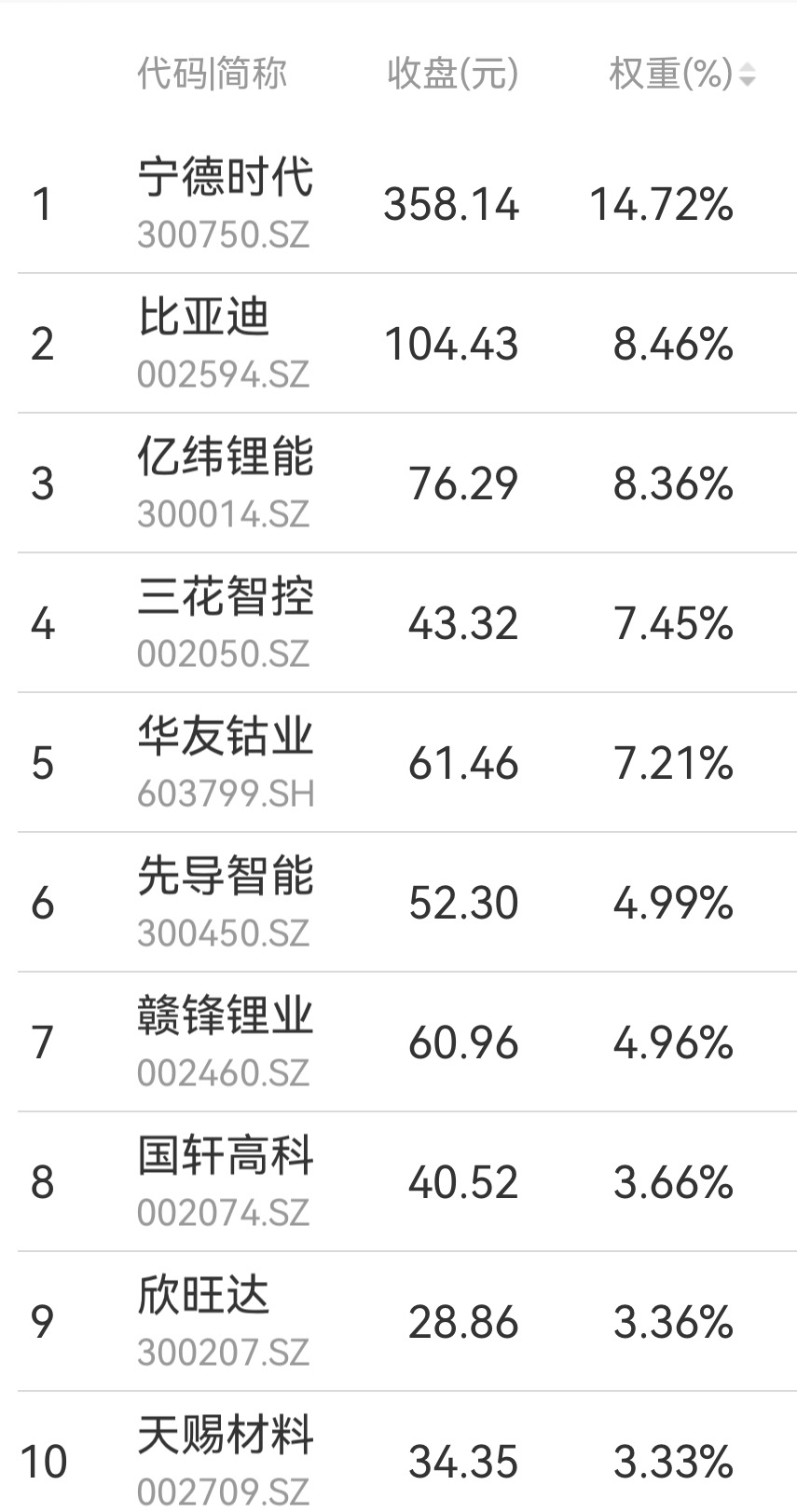 看看它的重仓股就明白了:宁德时代,全球动力电池当之无愧的龙头,在这个指数里的权重占比就超过了14%;比亚迪,新能源汽车一体化巨头,权重也达到了11%以上。这两家都是在技术研发和产业化方面的企业,护城河深得很。更值得关注的是,这个指数里还藏着不少你可能不太熟悉,但在各自细分领域绝对是“隐形冠军”的企业。比如做电解质材料的天赐材料、做正极材料的当升科技、做负极材料的璞泰来等等。这些公司名气可能不如宁德、比亚迪响亮,但在它们那一亩三分地里,技术优势和市场地位都是杠杠的。