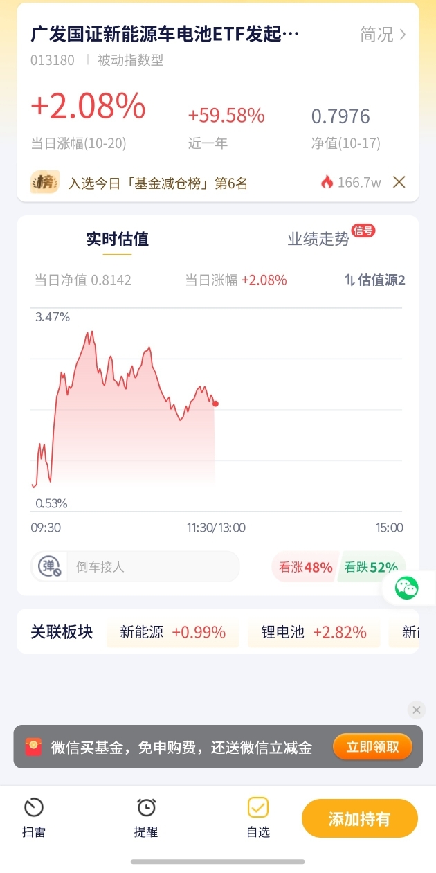 【广发国证新能源车电池ETF估值播报+10.20行情】广发国证新能源车电池ETF今日估算涨幅+2.08%!新能源车电池板块今日涨势可以,收益提前看~- 今日A股港股科技、创新药板块发力,相关基金跟着涨,持仓体验还行~