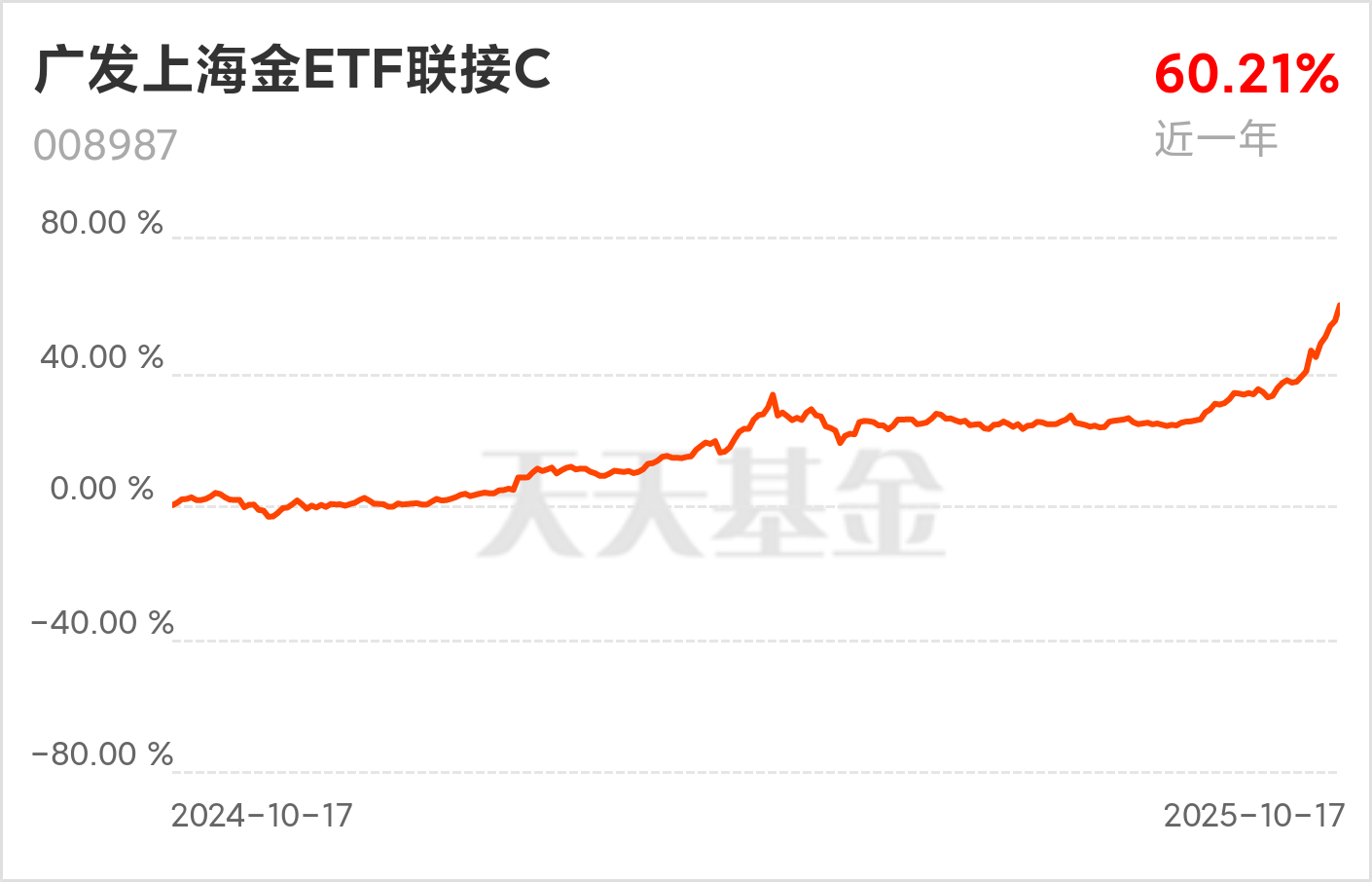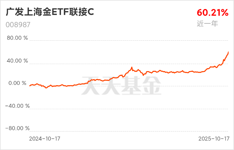 近一年涨幅已经来到了60%,姚姚看着也是眼馋,节节新高,确实是有点按捺不住了,今天好不容易迎来回调,先趁着这个机会打入1000元$广发上海金ETF联接C(OTCFUND|008987)$!