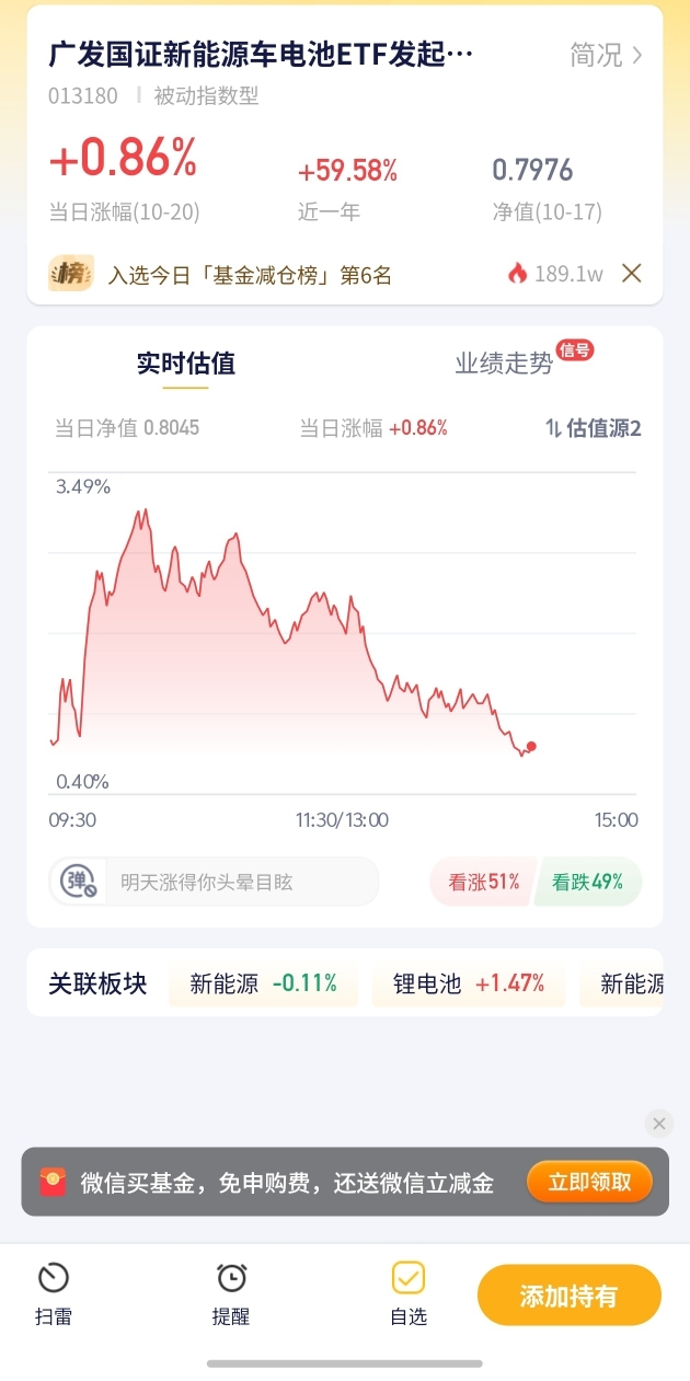 【广发国证新能源车电池ETF估值播报+10月20日行情】广发国证新能源车电池ETF估涨+0.86%!新能源车电池板块今日小涨,新能源行情还能走多远?一起看看~ 今日A股科技和新能源板块表现突出,数字经济混合基金涨2.47%,恒生科技ETF涨2.31%,新能源车电池、汽车指数基金也有不同程度上涨,市场资金似乎在往这两个方向聚集,后续可以多关注它们的动向~