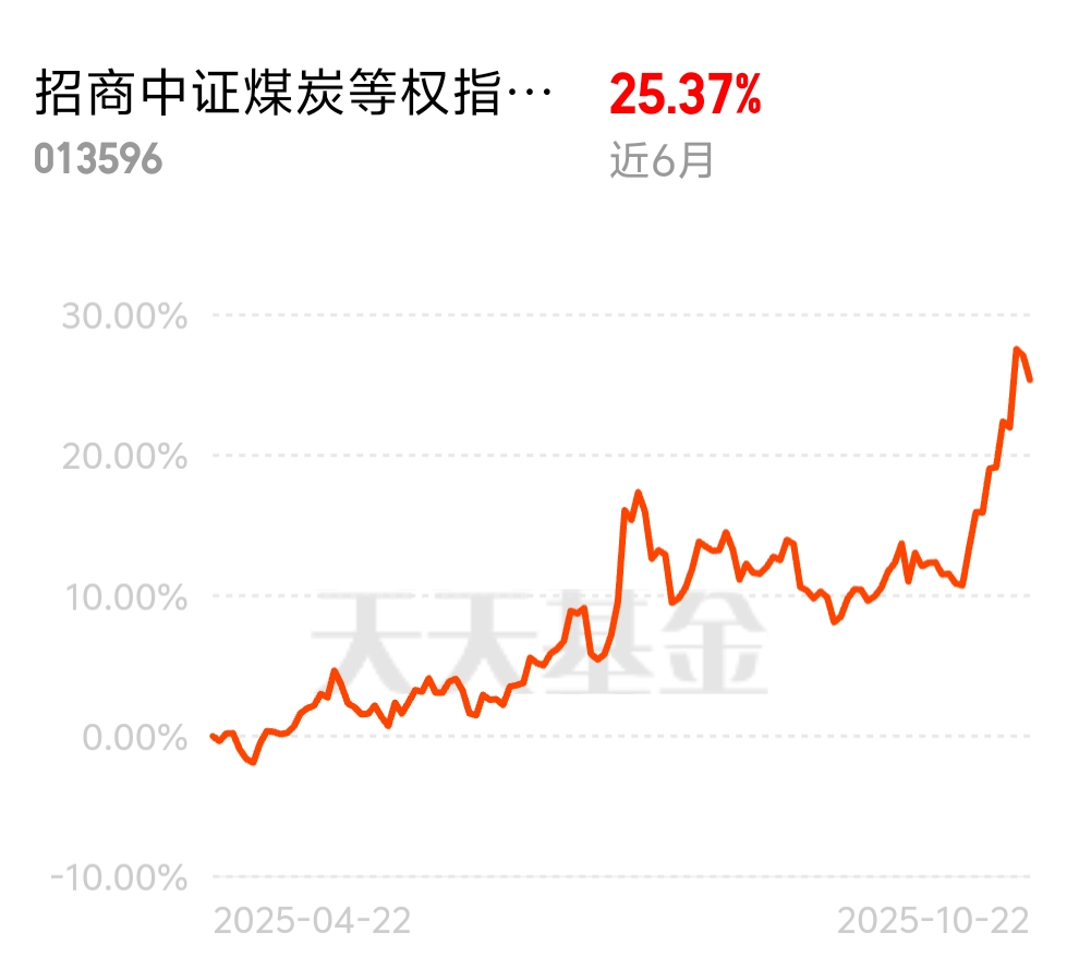 谁都能看出,煤炭供给端反内卷控产能,需求端消耗激增,煤价持续走高,避险资金还扎堆。招商中证煤炭等权指数C近6个月25.37%,当前3.98的涨幅比2.1的指数强不少。