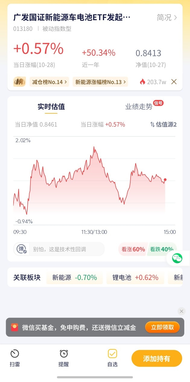 广发国证新能源车电池ETF今日预估涨幅+0.57%!新能源车电池板块表现尚可,该基金在新能源布局中持续发力。