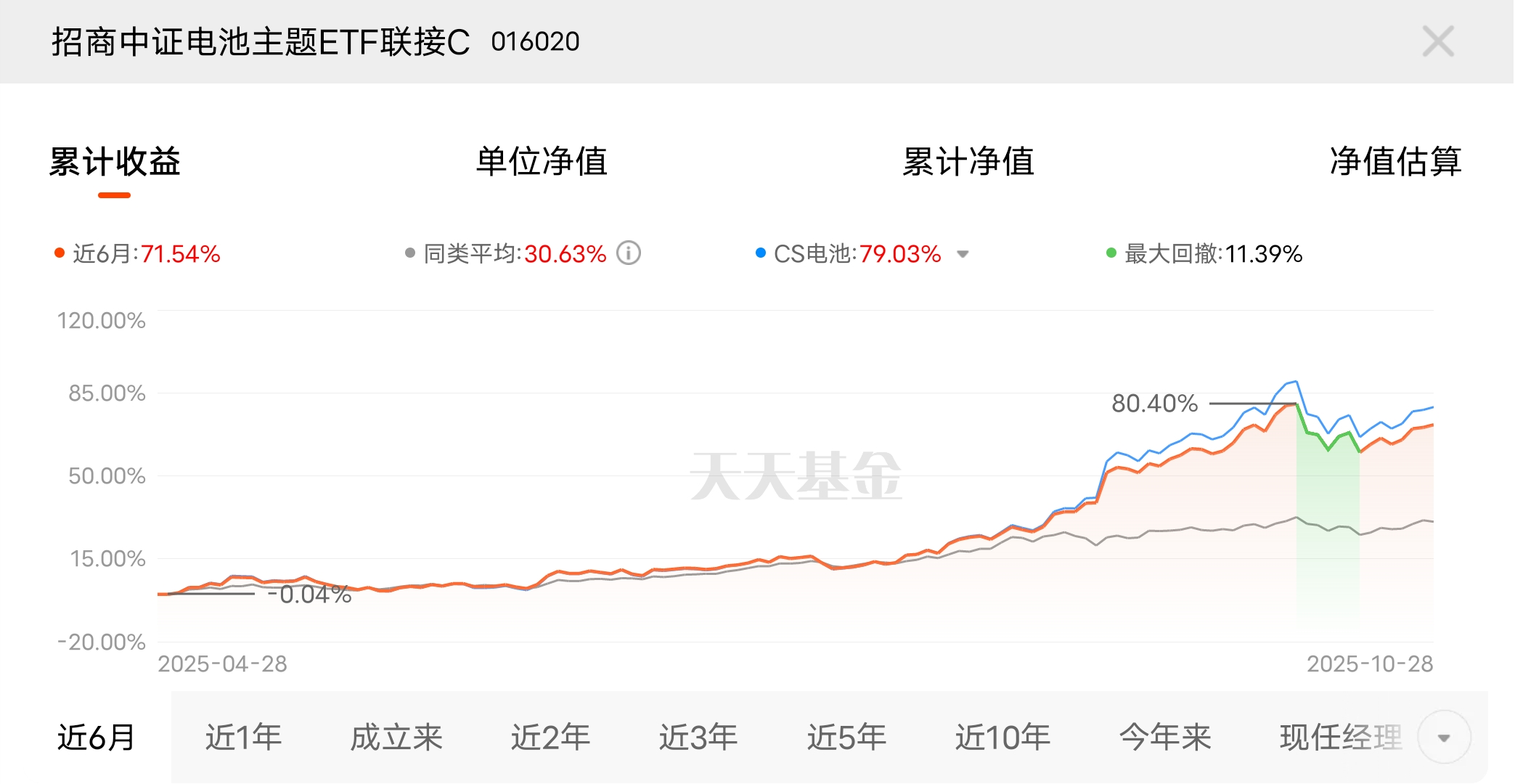 电池行业回调后成了布局良机,现在进场时机正好,别错过了。招商中证电池主题ETF联接C值得考虑,近6个月71.54%的收益有底气。