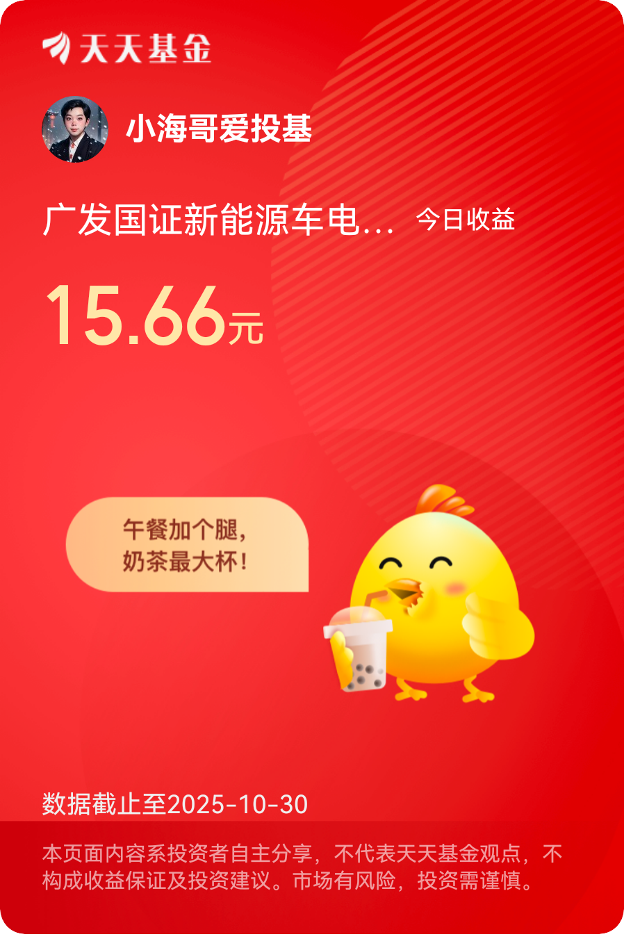 我持有的$广发国证新能源车电池ETF联接C$ (013180)今晚更新净值上涨0.73%,持仓收益率接近6%了,而且这支产品热度同类产品第一名,说明获得了大量投资者的认可。
