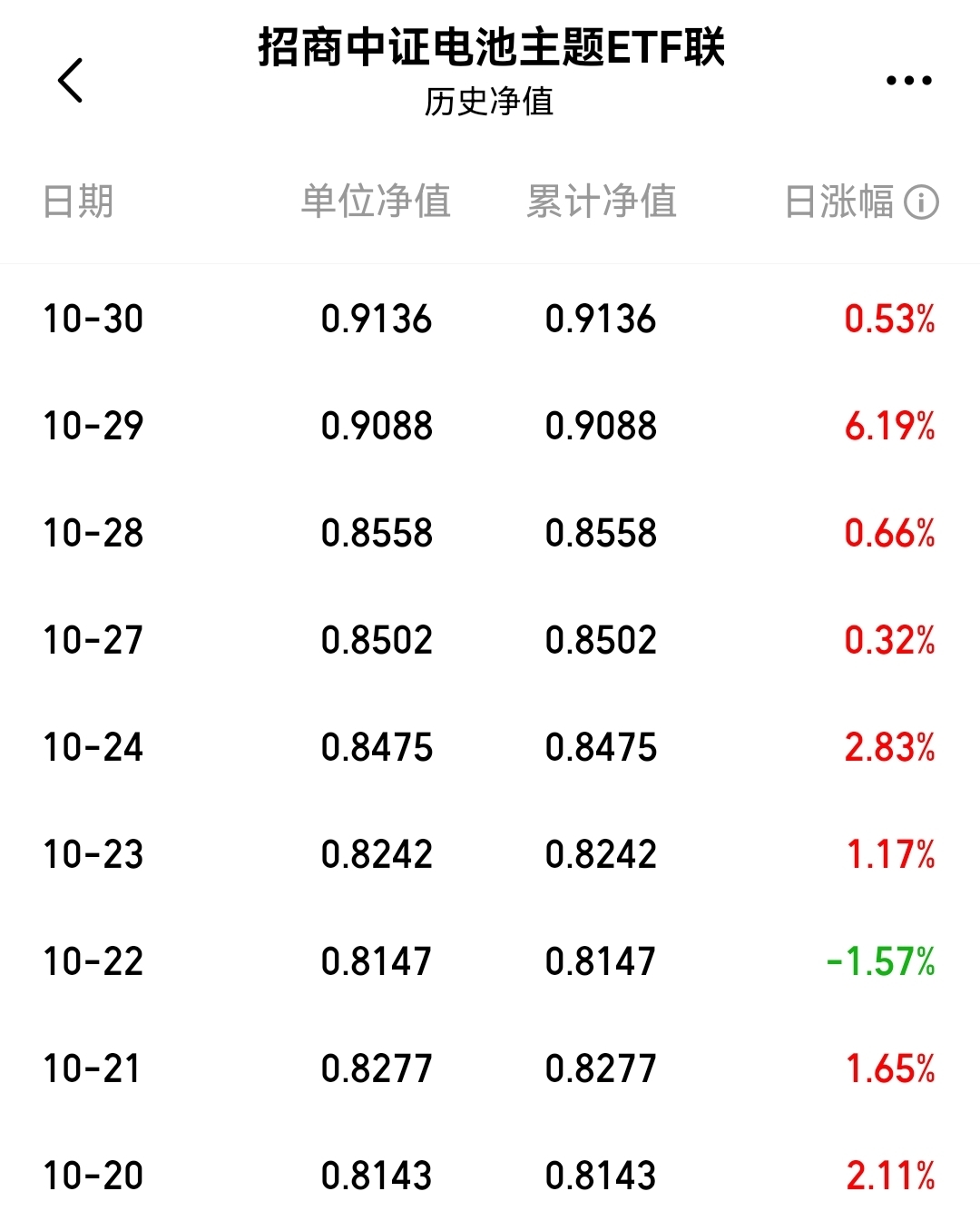 $招商中证电池主题ETF联接C$ 这支,持仓电池板块,近1周收益已经有10.85%,近半年收益81.82%了,今天继续反弹,也已经连涨7天,资金高低切背景下,止盈资金也是全面回流,有望成为阶段主线,我反正看好长期的!