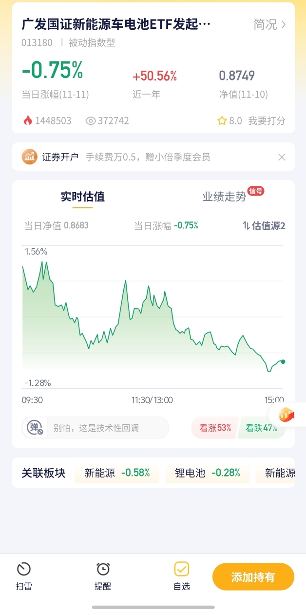 5. 【广发国证新能源车电池ETF估值播报+11.11行情】广发国证新能源车电池ETF今日预估涨幅-0.75%!新能源车板块回调,属短期波动。