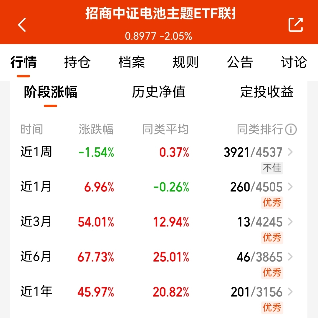 我还是看好这支$招商中证电池主题ETF联接C$ ,近1个月涨6.96%了,近半年收益67.73%,还是持续跑赢CPO等科技板块的,尤其是电池目前利好较多,资金抱团安全性高,反倒更能吸引资金回流了,趋势更能夯实!