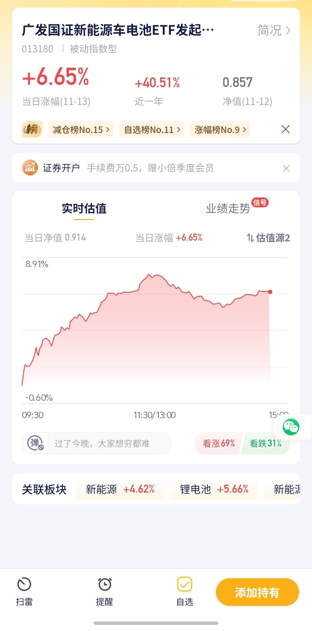 广发国证新能源车电池ETF今日预估涨幅6.65%!新能源车板块发力,该基金在自选里涨势靠前,表现很亮眼