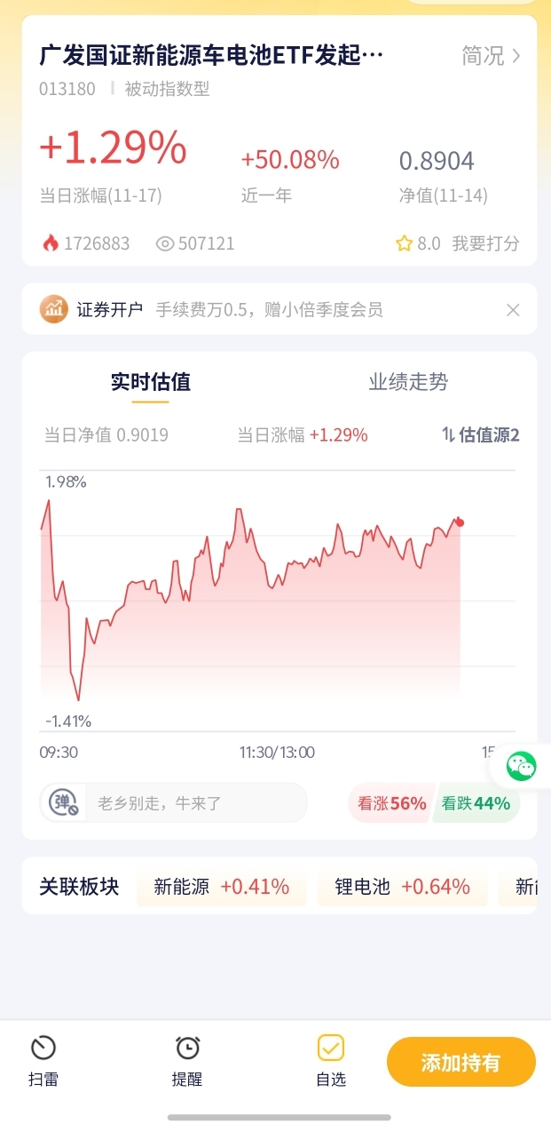 广发国证新能源车电池ETF今日预估涨幅+1.29%!新能源车产业链发力,这只基金也跟上了上涨步