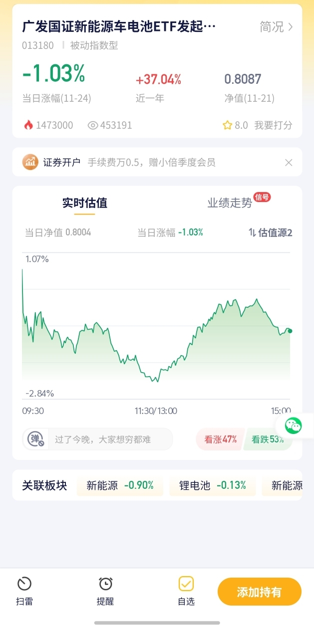 广发国证新能源车电池ET今日预估跌幅1.03%!新能源车电池板块今天有小调整,属于短期波动