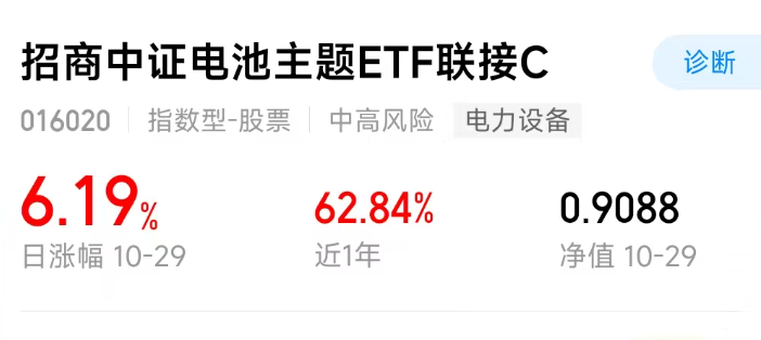 今天大科技集体回调,昨天表现强势的电池板块,今天继续上涨,$招商中证电池主题ETF联接C(OTCFUND|016020)$估值+0.55%,涨势不错,昨天大涨+6.19%,涨幅领先,近期固态电池表现活跃,已经跃入主线行列,再叠加各种利好,投资确定性较高。