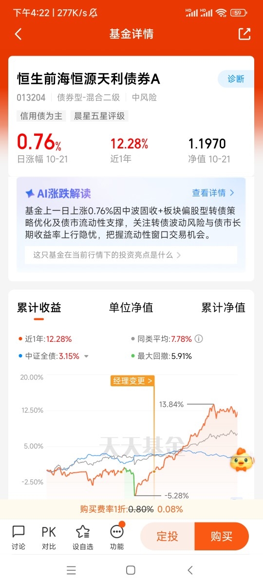 10月以来,A股市场的剧烈波动像一场突如其来的暴风雨,让我这样的普通投资者彻底陷入了焦虑。看着账户里的数字随行情上蹿下跳,既怕继续持仓遭遇更大回撤,又怕清仓离场错过潜在反弹,这种"两难困境"几乎每天都在折磨着我。直到了解到$恒生前海恒源天利债券A$(013204),我才终于找到了破解当下投资困局的答案,它身上的诸多特质,恰好击中了我对"稳中求进"的所有期待。