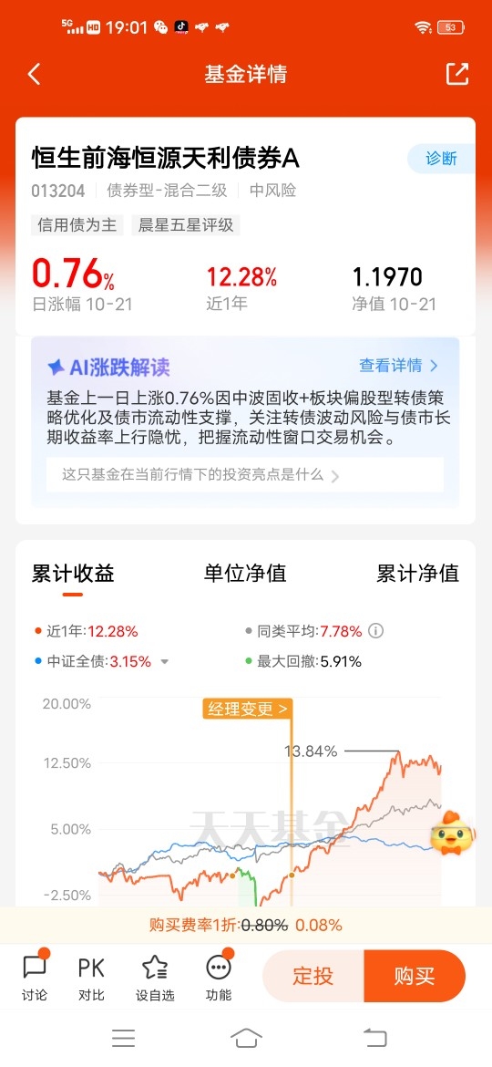 这只二级债基最吸引我的特点是:攻守兼备、稳中有进。债券投资占比不低于80%,权益投资占比不超过20%,既能享受到债券类资产相对“稳健”的特质,还能捕捉到权益市场上涨带来的收益,是平衡风险与收益的优质工具