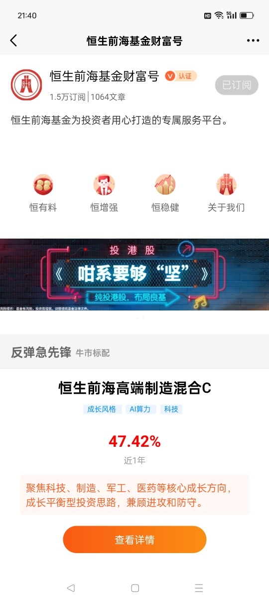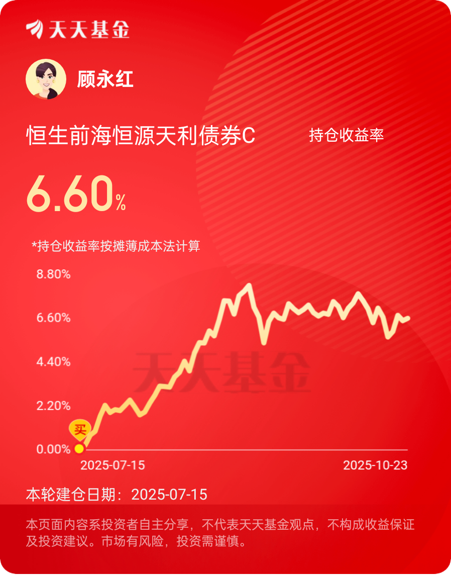 我是恒生前海基金的长期忠实粉丝,目前的资产配置中,通过构建恒生前海投资组合,来平衡“进攻”与“防守”:坚定持有$恒生前海短债债券C$ ,获取稳健收益;坚持定投$恒生前海恒源天利债券C$ ,增强组合收益;将会继续配置恒生前海的固收+产品、权益产品,获得更好的收益回报和持有体验!@恒生前海基金
