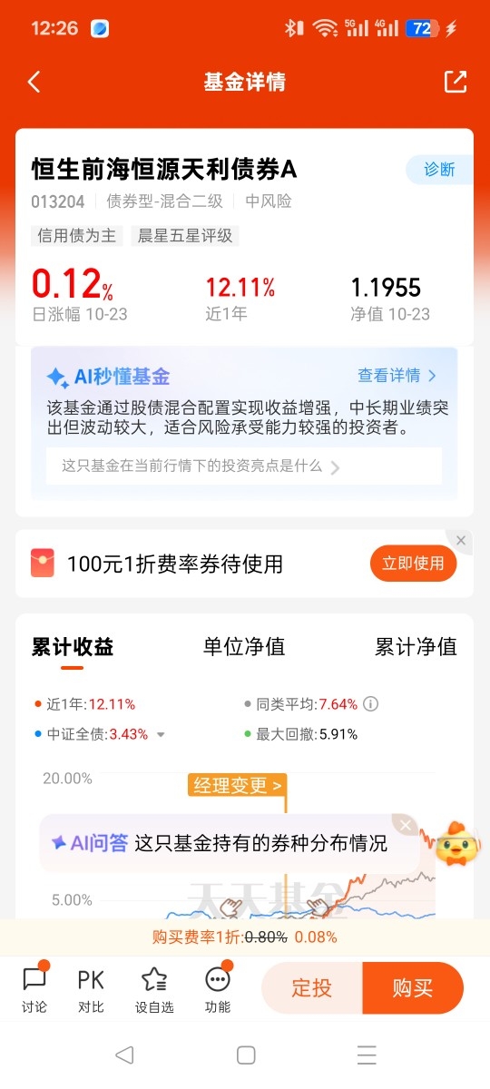 它近一年收益有 12.11%,比同类平均高了快 8 个百分点,近一年最大回撤 5.91%,比不少纯债基金还抗跌。去年 10 月股市跌得厉害的时候,它居然还涨了 1.2%,这点确实挺惊喜的。还有个细节,基金经理调仓挺灵活的,去年四季度加了转债,今年二季度又减了久期,没跟着市场惯性走,中小基金公司这点好,决策快,不会像大公司那样反应慢半拍。对了,机构持有率高达 99.65%,说明专业玩家也认它,而且 A 类份额每年总费率才 0.4%,比同类低不少,长期拿着也省成本。