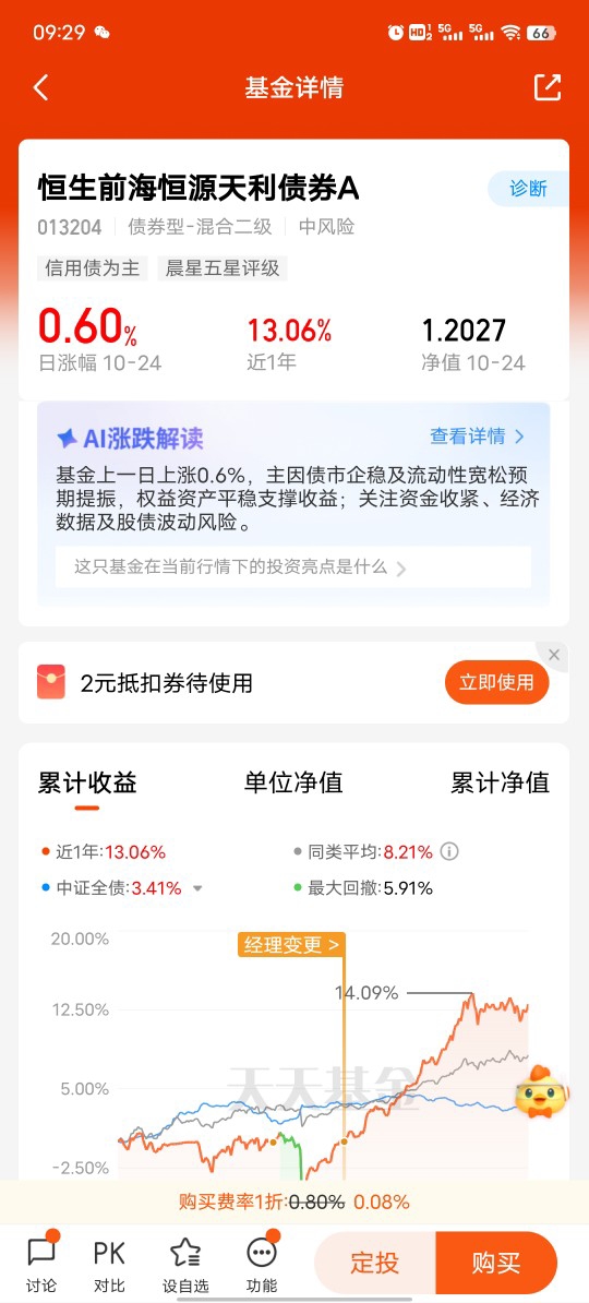 $恒生前海恒源天利债券A$ 最吸引我的地方是长期持有收益稳定,该基金从2021年8月18日成立以来,至今已上涨20.27%,作为一支二级债基,从2023年至今,已连续三年正收益,2023年上涨6.73%,2024年上涨4.93%,而今年至今更是上涨13.44%。虽然2022年下跌6.17%。但经过三年的连续上涨,早已将2022年的下跌转为正收益20.17%。所以基金是需要长期持有的。@恒生前海基金