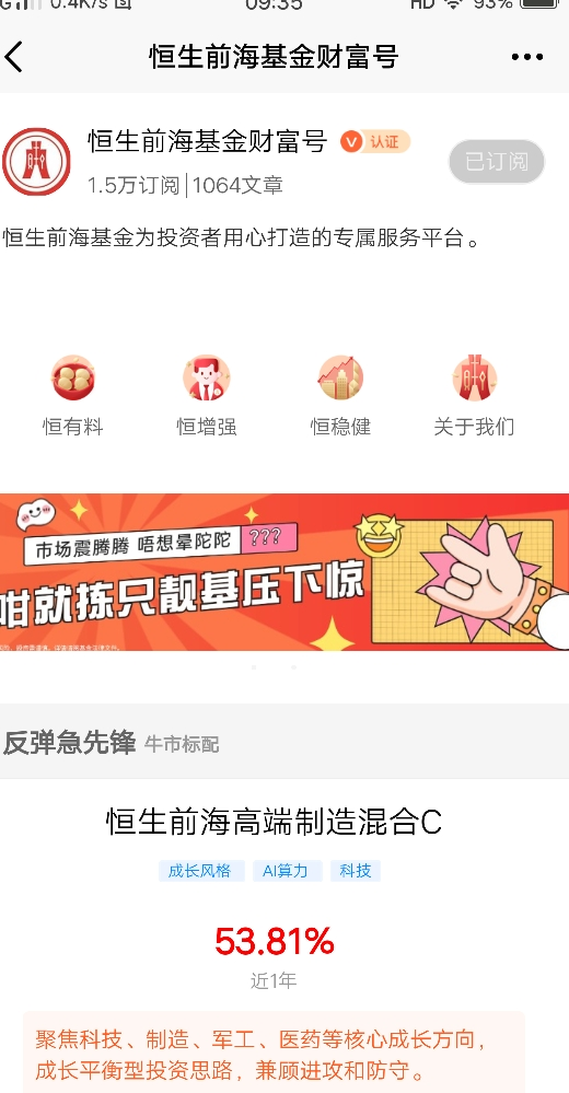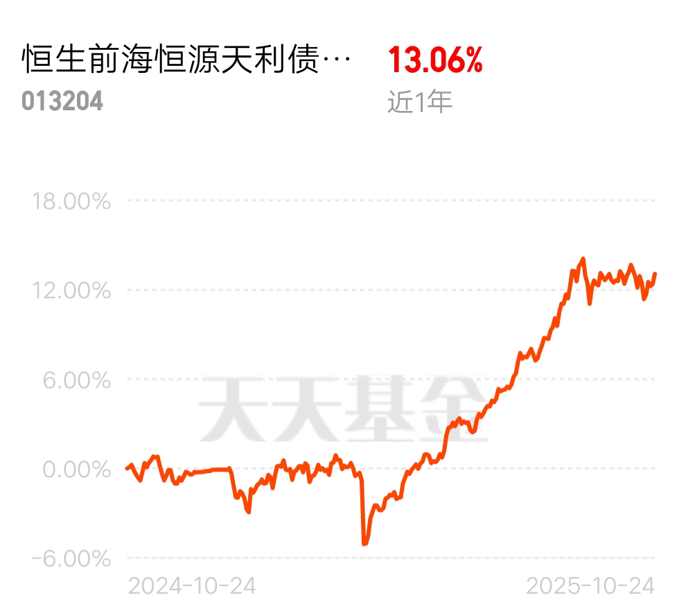 $恒生前海恒源天利债券A$ 最吸引我的特点是这支基金即可以买股票资产也可以买债券资产,有少量的比例投资股票,在股市行情好时可以获取超额收益,因为该基属于二级债基,而且股票和债券相关性低,该量种资产呈跷跷板效应,当股市下跌时,由于该基金有大比例的债券资产,可以抵消股票下跌的亏损,这是该基金与股票基金的不同之处。@恒生前海基金