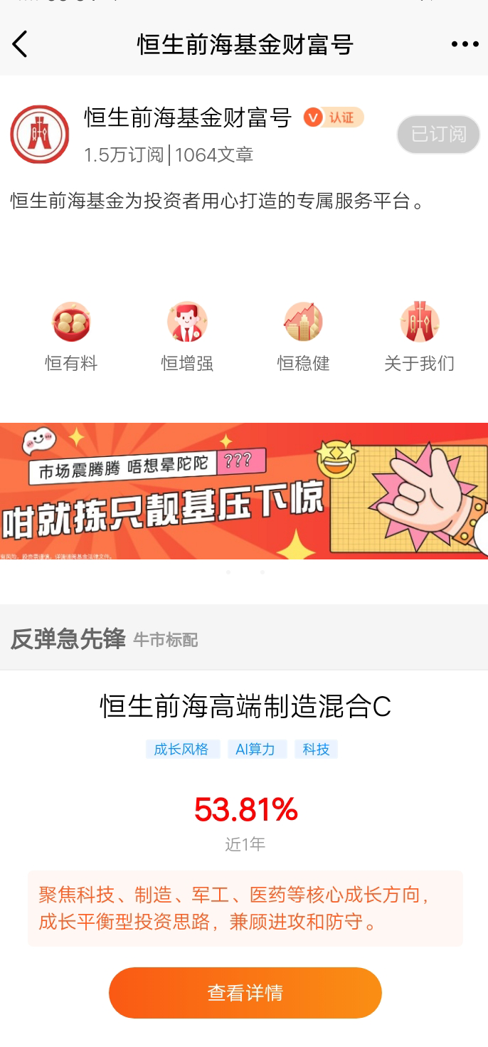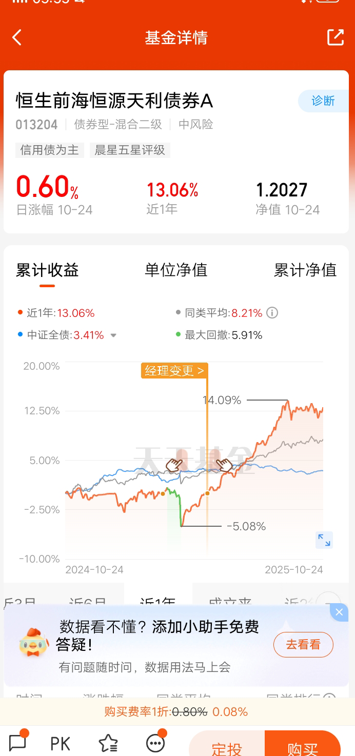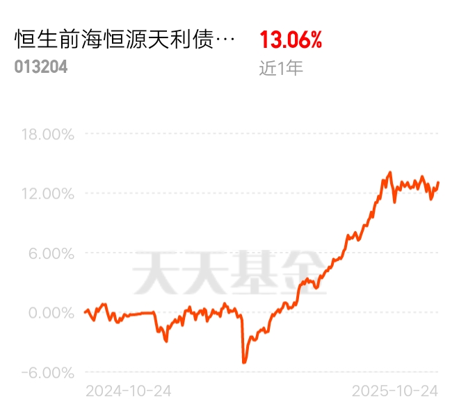 我最喜欢$恒生前海恒源天利债券A$ 的特点是该基通过股债混合,能够平衡收益与波动,在债券投资部分,追求稳健票息。在权益部分,注重成长与价值风格均衡,分散配置。即能在股市行情好时获取超额收益,又可以通过债券为主的底仓减少股市下跌带来的亏损。该基金近6月上涨14.60%。近三年上涨23.20%。是一支业绩优秀的二级债基。@恒生前海基金