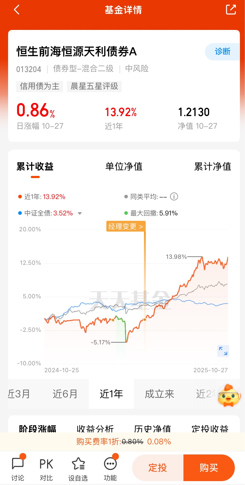 长期来看,二级债基指数涨幅是纯债基金的4倍多。恒生前海恒源天利A近一年收益12.91%,今年以来涨12.64%,远超同类平均的4.7%。其“轻权益+高评级”布局(股票占比3.27%,债券以AAA级为主),在控制风险的同时实现收益增强。