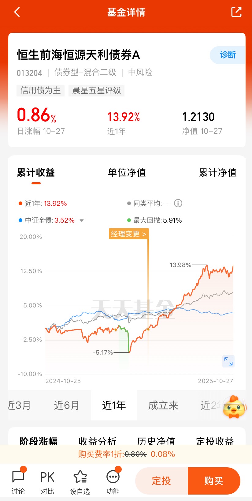 从业绩表现来看,恒生前海恒源天利债券A在过去几年中展现出了稳健且优秀的回报能力。截至2025年10月24日,该基金近一年的收益率为13.06%,大幅超越同期中债-综合(全价)总值指数的表现。这一业绩充分证明了基金管理团队在把握市场机会、实现基金资产增值方面的专业能力。
