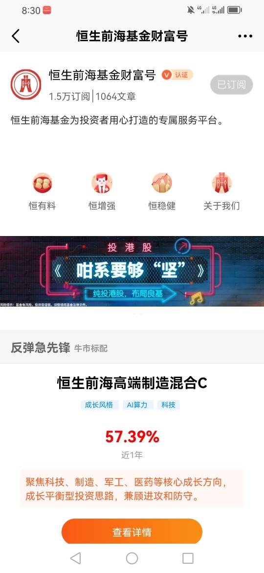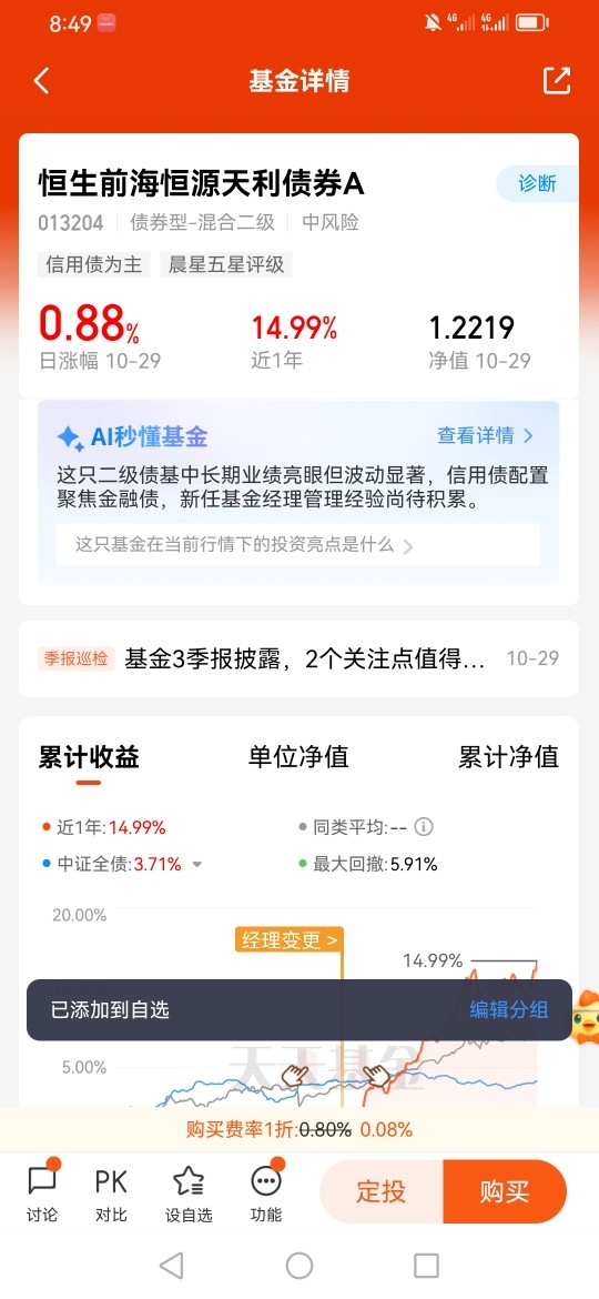 因此我关注了恒生前海恒源天利债券A(013204),因为它的前五大重仓债都是安全性很高的债券,同时它重仓的股票也是成长性较好的公司,这种搭配是相当合理的。@恒生前海基金