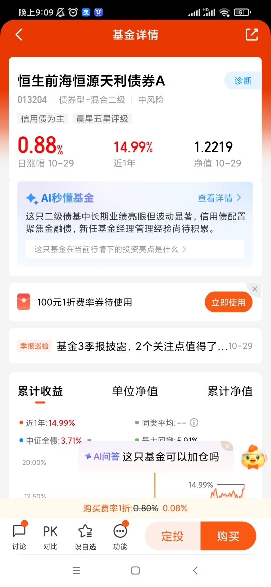 结合市场环境来看,目前经济动能整体偏弱,需求仍显不足。宏观政策仍在持续加码的过程中,财政政策加力仍有预期空间,货币政策偏呵护,需要持续跟踪。债市短期内预计偏震荡,但配置价值和票息策略仍有可为空间。$恒生前海恒源天利债券A$ 秉承严控信用风险的前提,动态调整组合结构,在资产流动性、投资性价比间寻找机会和平衡点。当前震荡行情下我认为应该合理搭配相关性较低的资产,不仅能有效控制风险,同时还能享受各类资产轮动上涨的福利,组合的风险收益更加平滑,持有体验更好;而在优选基金的过程中,对基金进行组合投资,有助于降低单一板块带来的风险。