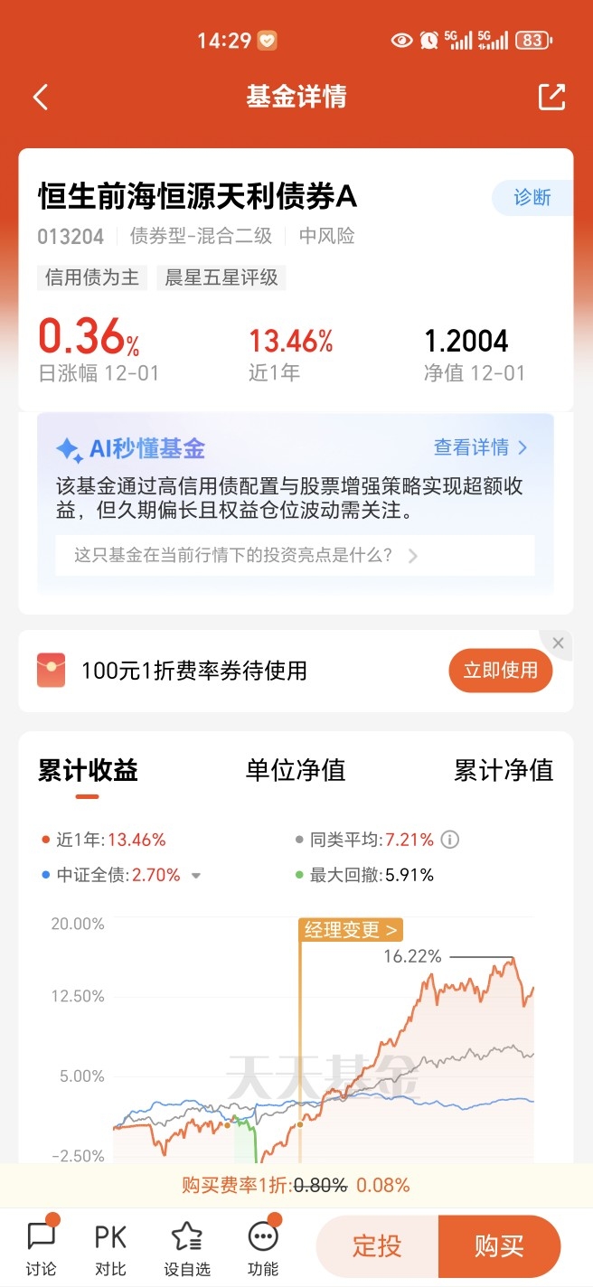 1. 业绩长期领先且风控出色:截至2025年12月1日,其净值达1.2004,近12个月涨幅13.46%,近3年收益率更是高达23.38%,在同类341只基金中排名第5。它在不同市场环境中表现稳健,2025年Q2股市反弹时净值上涨,2024年Q4债市调整时净值仅小幅下跌,近1年最大回撤远低于同期沪深300指数,风险“减震”效果显著。