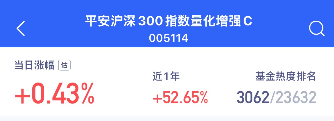 $平安沪深300指数量化增强C$今日估值上涨0.43%,表现不错哦,期待更新!