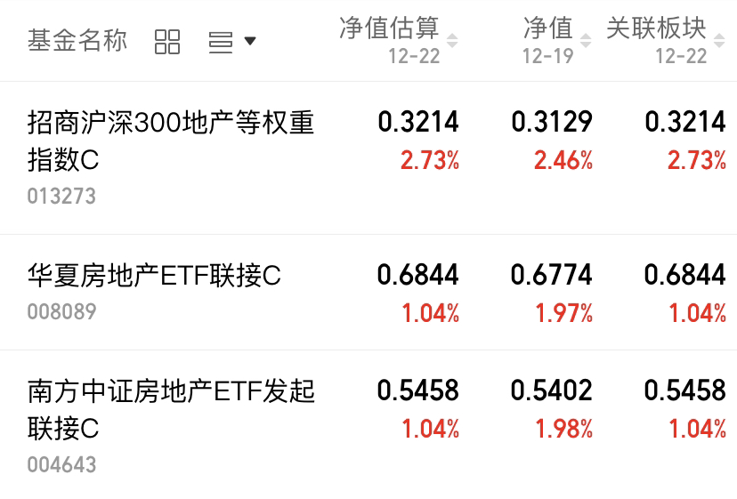任何行业都逃不开周期性规律。地产板块里的几只大盘股已经严重超跌,估值跌到了低位,现在就值得重点留意。$招商沪深300地产等权重指数C(OTCFUND|013273)$上周五上涨2.46%,$华夏房地产ETF联接C(OTCFUND|008089)$上涨1.97%,$南方中证房地产ETF发起联接C(OTCFUND|004643)$上涨1.98%。