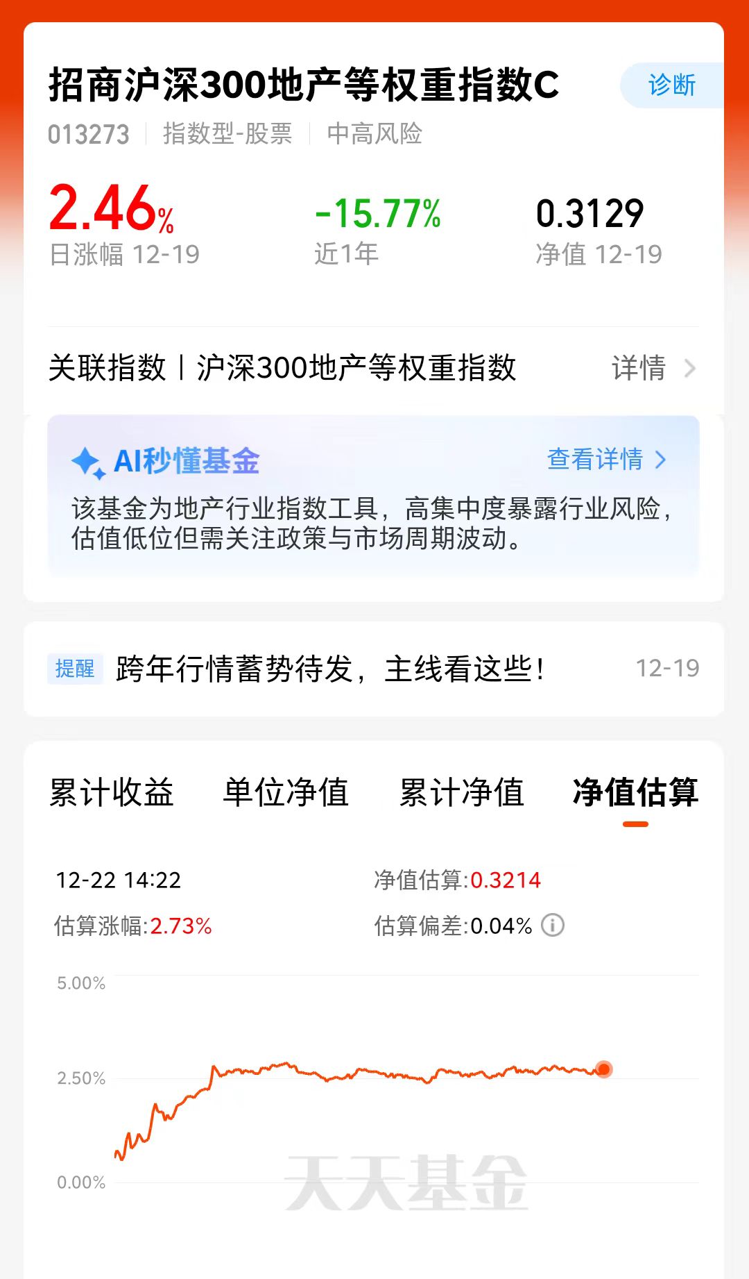 友友们,今天股市行情反弹给力呢,房地产板块上涨。$招商沪深300地产等权重指数C(OTCFUND|013273)$,上周五就上涨了2.46%,今天盘中估值继续上涨2.73%,看来在宽松的市场环境下,股市行情向好,市场对明年年初央行有可能实施进一轮降息颇有预期,以及更大力推动房地产市场止跌回稳。而且等权指数更有优势,提升小票占比,更具进攻性,可以关注一下。