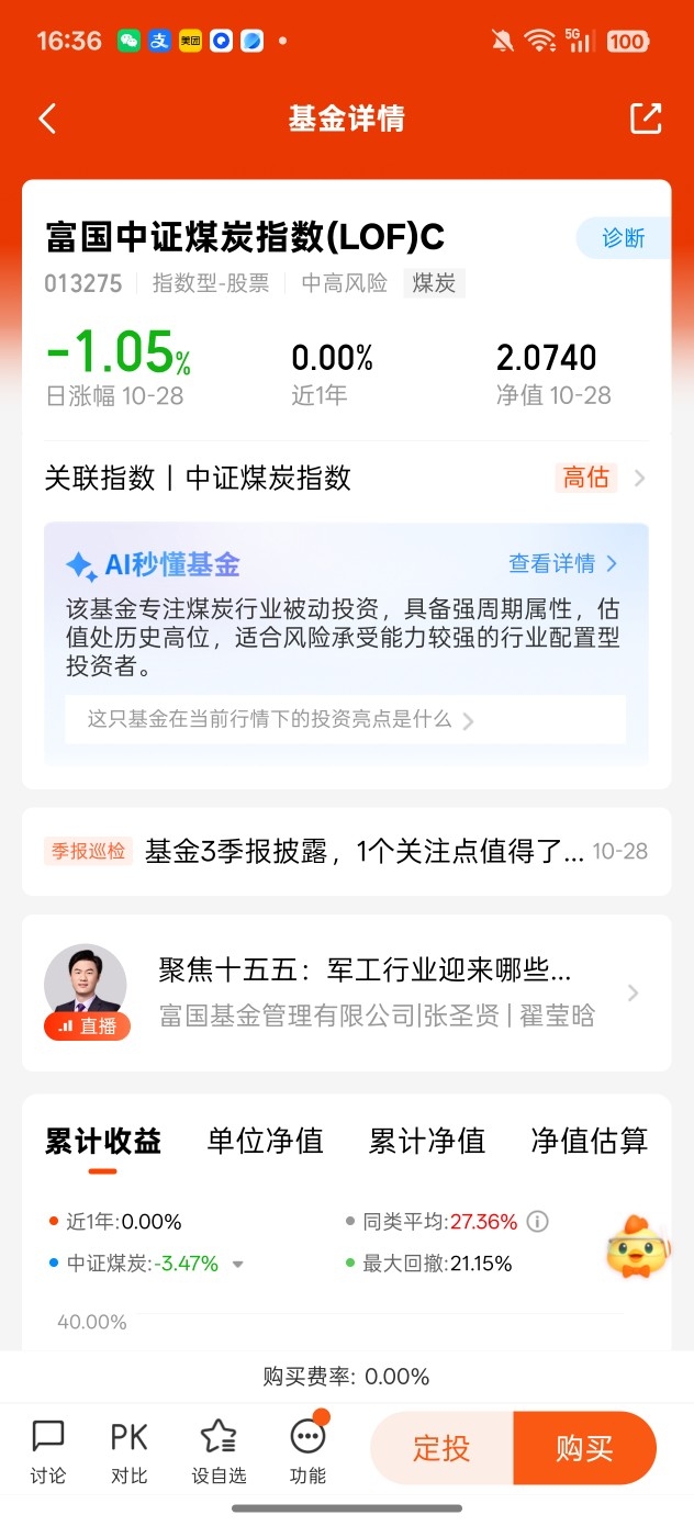 最近顺周期回暖,我拿的$富国中证煤炭指数(LOF)C$ 一个月涨了9%,跑赢大多数同类,前十大全是陕西煤业、中国神华这些“中字头”核心资产,跟踪误差才0.45%,跟指数几乎严丝合缝,老基金经理掌舵,拿得住也睡得着!