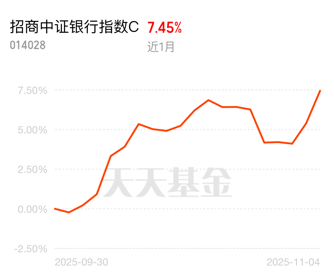 现在市场关注高股息的人不少,港股无风险收益率4~5%,境内还不到2%,A股银行吸引力更强。招商中证银行指数C近1个月涨了7.45%,可以看看。