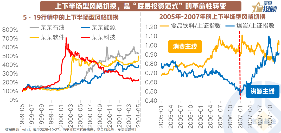 上下半场型风格切换,其本质绝非短暂的“高低切”的轮动游戏,而是宏观经济背景下“底层投资范式”的革命性转变。典型的如:“519”行情、2005-2007年的全面牛中,行业主线出现了明显的切换。