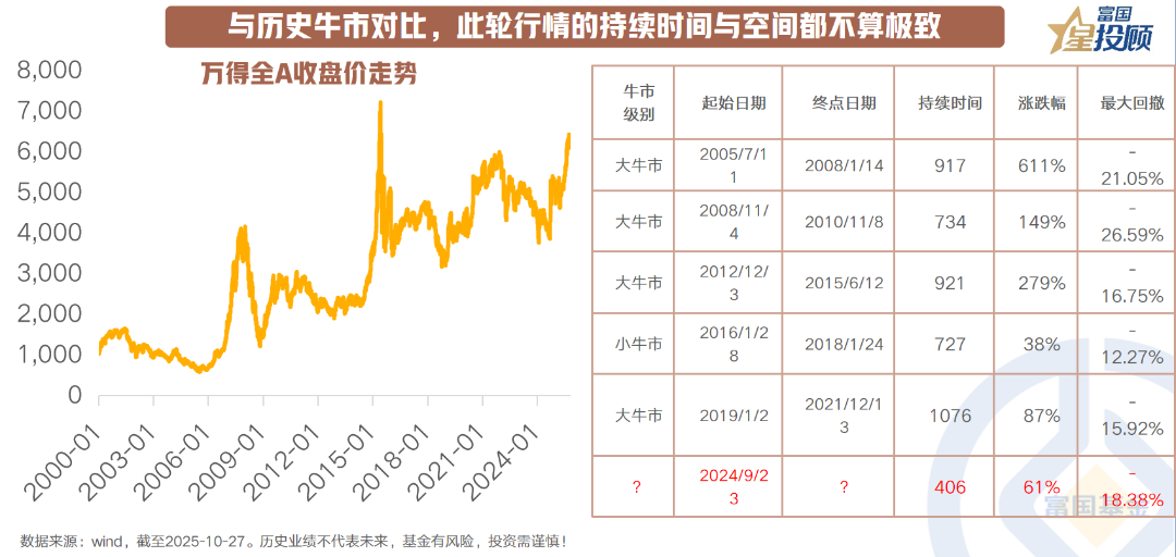 此外,与历史牛市对比,此轮行情的持续时间与空间都不算极致。2024年9月底以来,万得全A上涨61%。与前期的大牛市动辄1-2倍的涨幅,差异仍然较大。时间上看,从底部到当下也仅仅走过了406天。