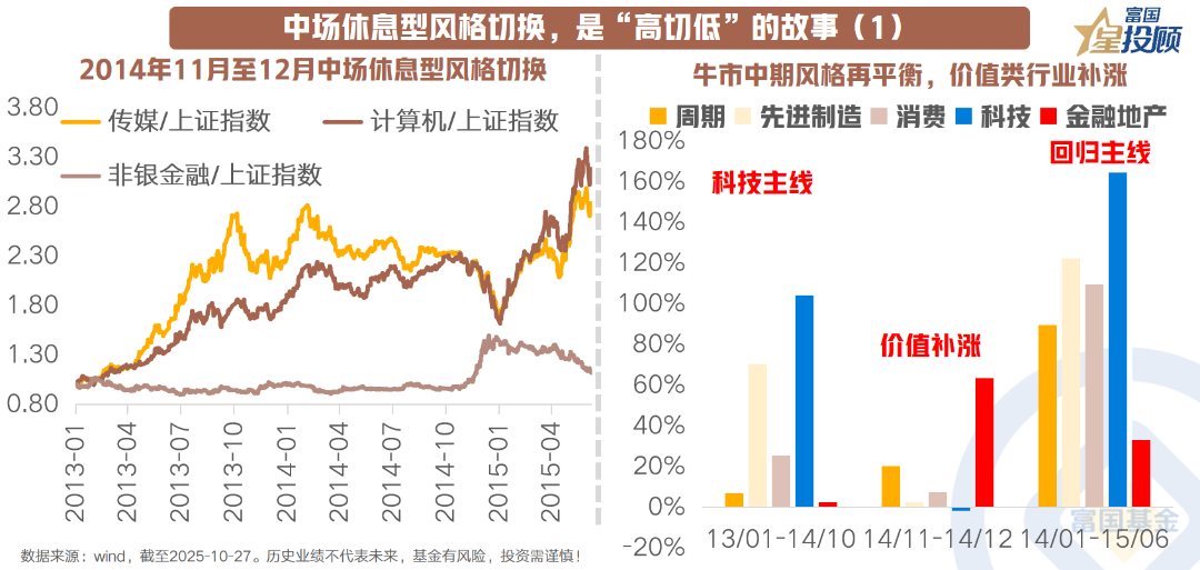 中场休息型切换,这恰恰是一个 “高切低”的故事,其核心驱动力并非宏观范式的更迭,而是交易层面极高拥挤度与极致估值分化下的技术性收敛。典型的情况如:2009年5月至7月、2014年11月至2014年12月,2020年10月至2020年12月。1)2009年A股在“四万亿”政策刺激的影响下,以有色金属、煤炭为代表的强周期板块大幅上涨,但大幅上涨后,资金寻求业绩确定性更高、估值更安全的“洼地”进行避险。2009年5月至7月,金融、地产、消费板块表现出明显的抗跌性,甚至逆势上涨。2)2014年前10个月,市场主线是中小盘成长股和题材股。11月央行开启降息周期,增量资金通过两融和大规模涌入,估值极低和机构持仓较轻的大金融板块集体起舞,而中小盘成长则滞涨甚至是下跌,出现了“满仓踏空“的现象。