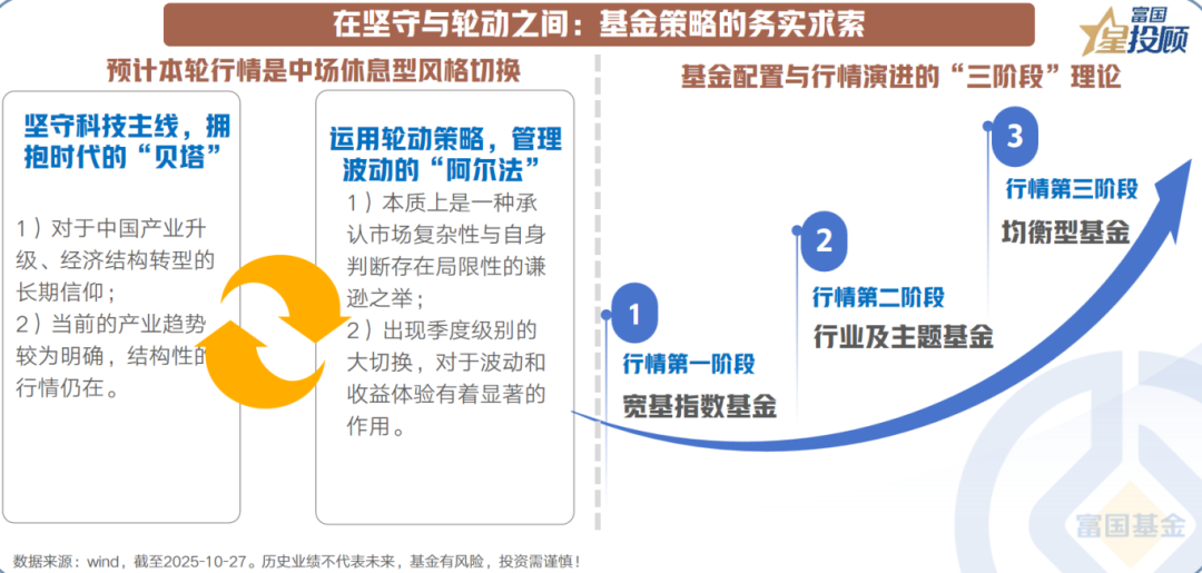 当然,从基金实操出发,还可以借鉴的是行情演进的“三阶段”理论。基金投资者的配置行为呈现出清晰的周期性路径,基本遵循着从“宽基指数基金”到“行业及主题基金”,最终回归“均衡型基金”的轨迹。行情初期,布局宽基指数基金,市场整体处于估值低位,主线尚不明确的阶段,如2024年9月至2025年1月;行情中期,追逐行业及主题基金,此时投资主线清晰,结构性行情成为主导;行情后期,回归均衡性基金,投资重心从“进攻”转向“攻守平衡”。