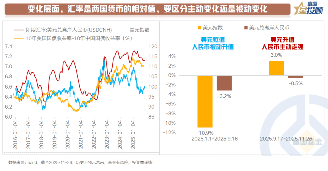 4)变化层面,汇率是两国货币的相对值,要区分主动变化还是被动变化
