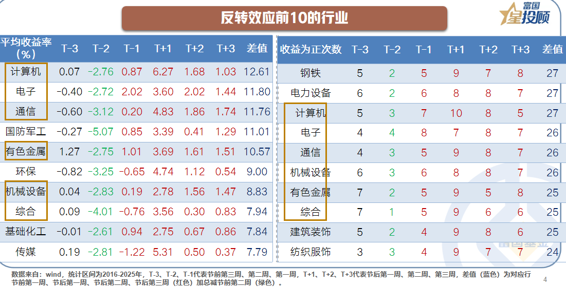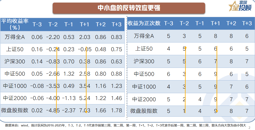 以过去10年(2016-2025年,下同)的数据作为样本,分别计算万得全A指数在春节长假前后三周的表现可以发现,A股市场在春节前表现相对偏弱,在春节后表现相对偏强。一种可能的解释是,春节长假时间较长,海外可能出现“幺蛾子”,再加上假期消费需要,部分投资者会选择“落袋为安”。